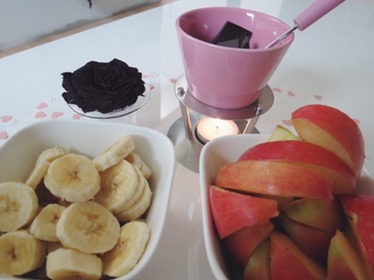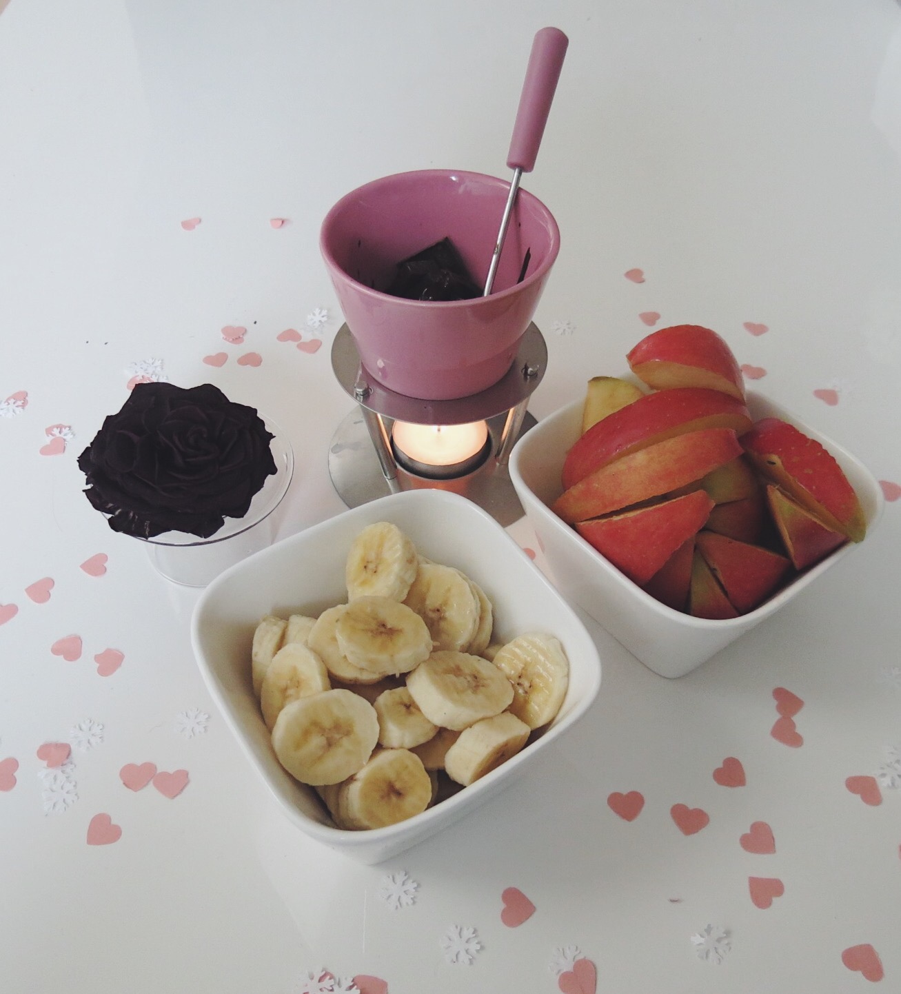 La première « recette », si on peut dire recette puisqu’elle n’était vraiment pas compliquée, est une fondue au chocolat. Pour rester healthy on opte pour un chocolat noir qui est très bon pour la santé et pour des morceaux de fruits. Cette recette ne prend vraiment pas longtemps à faire, il faut juste couper des fruits en morceaux et faire fondre le chocolat. Si vous n’avez pas de fondu, vous pouvez très bien mettre vos carrés de chocolat au micro ondes mais en faisant bien attention de remuer régulièrement pour évider que le chocolat ne crame.